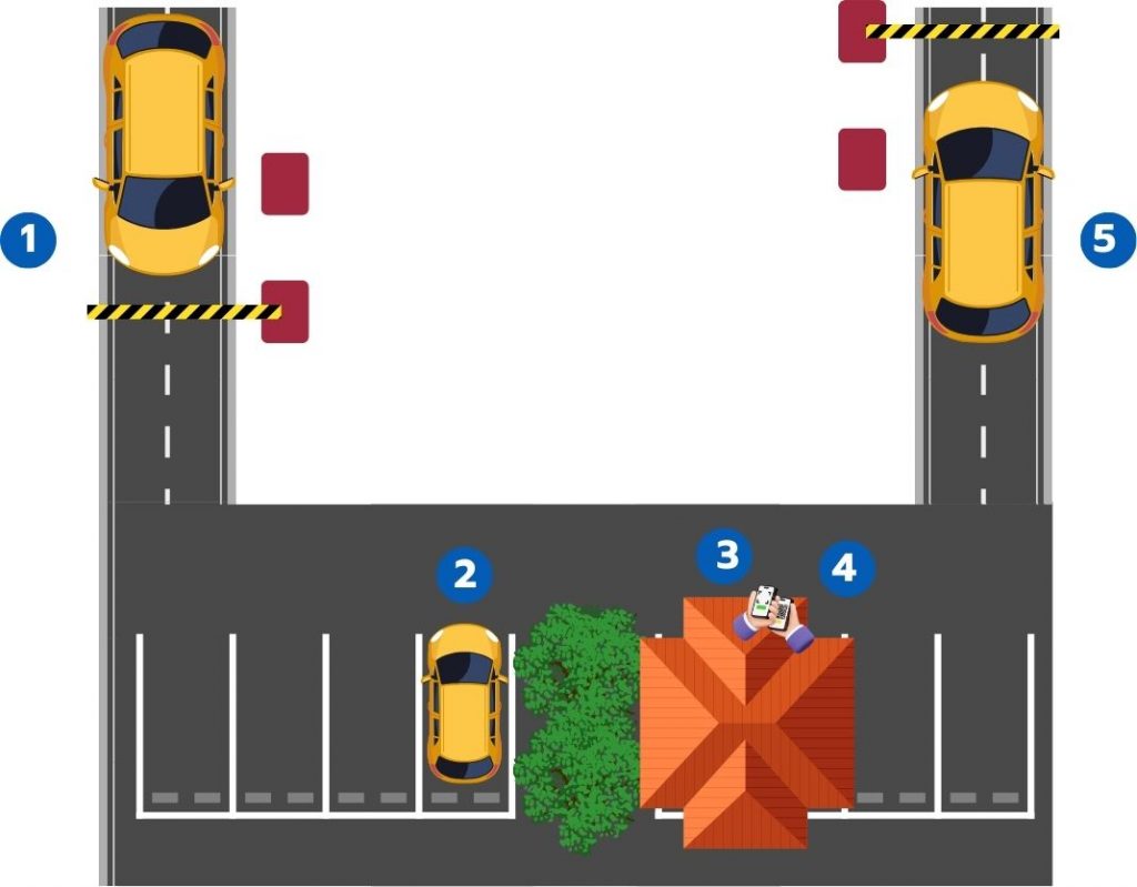 Visitors exit by scanning the QR ticket or via LPR recognition, which opens the barrier automatically